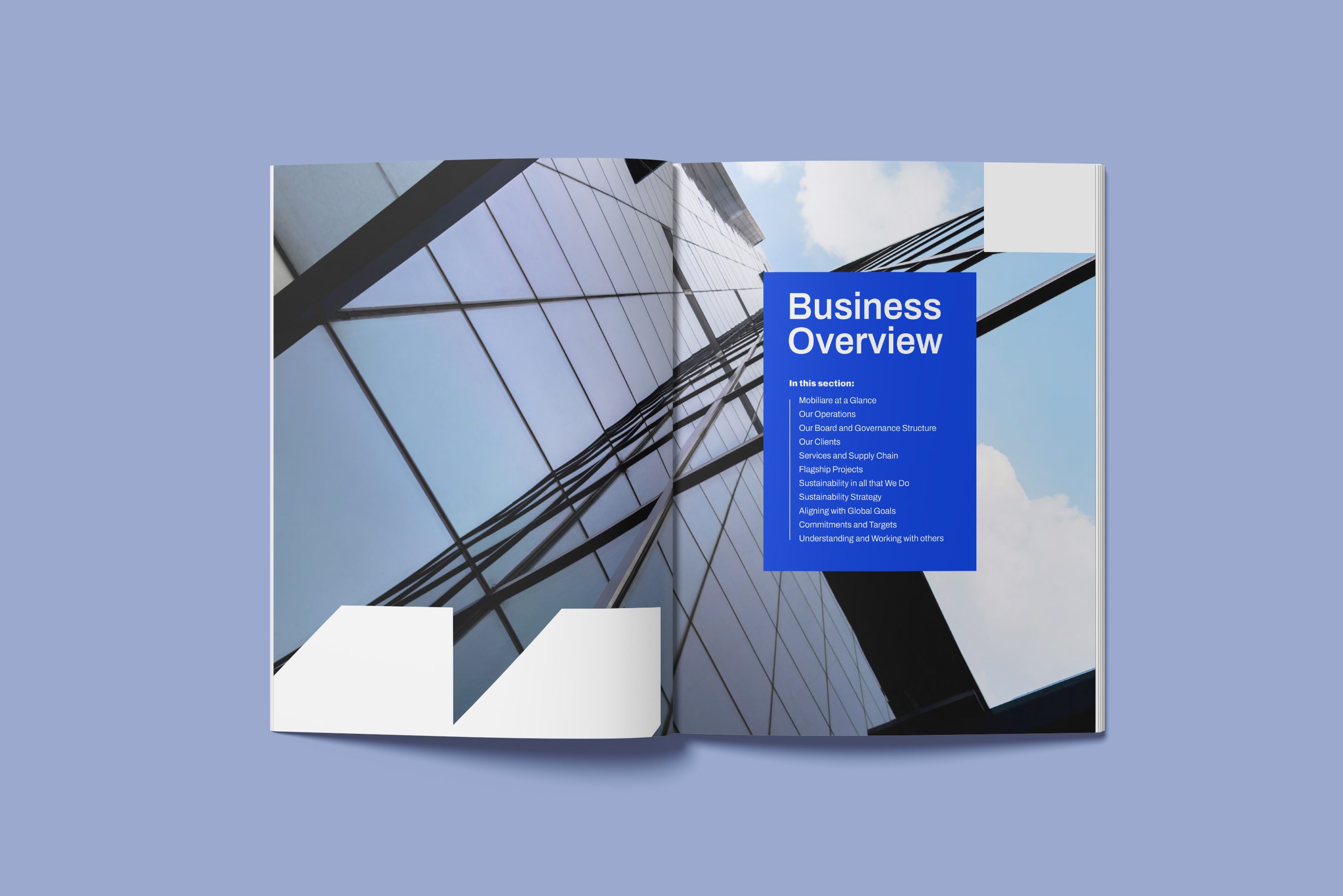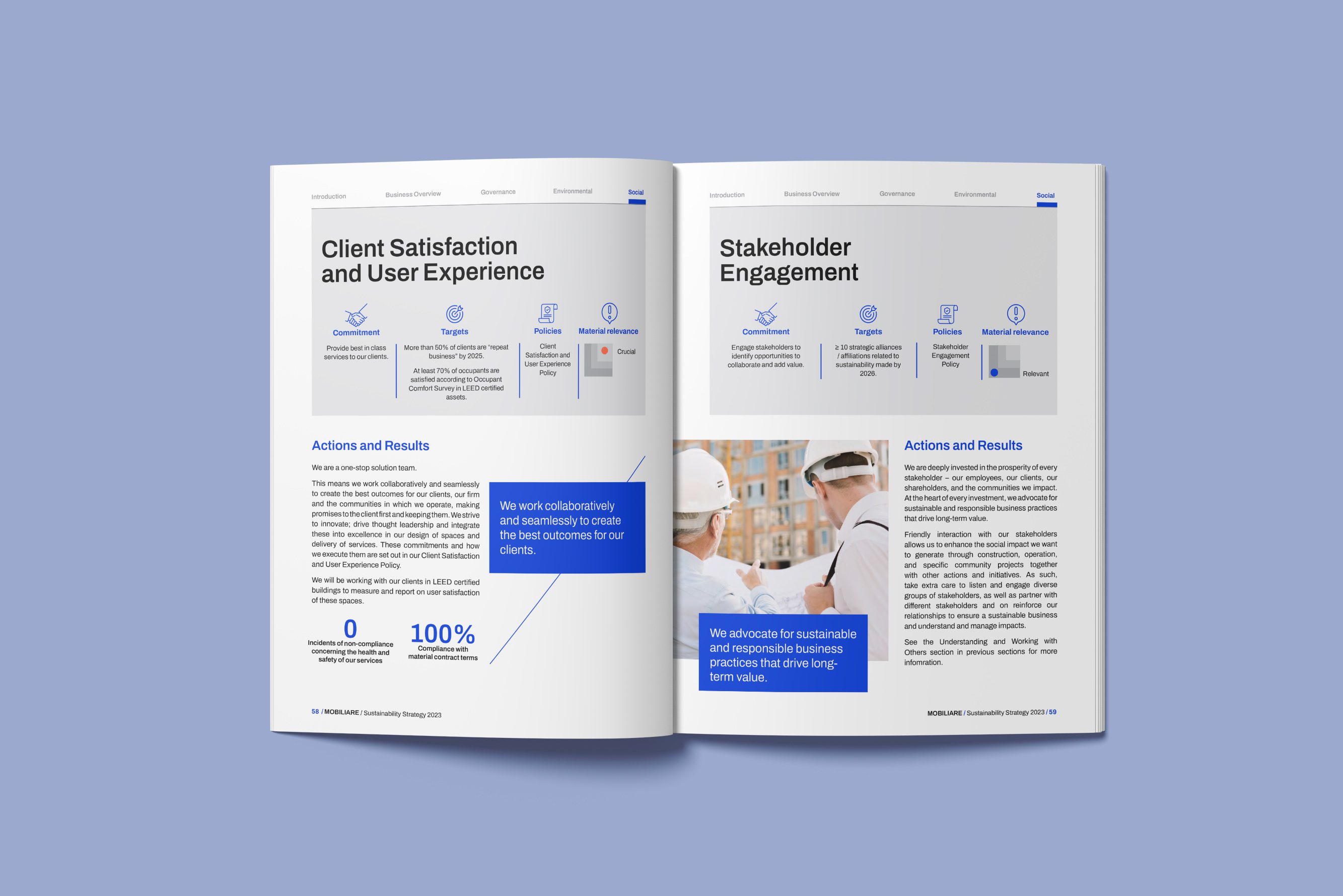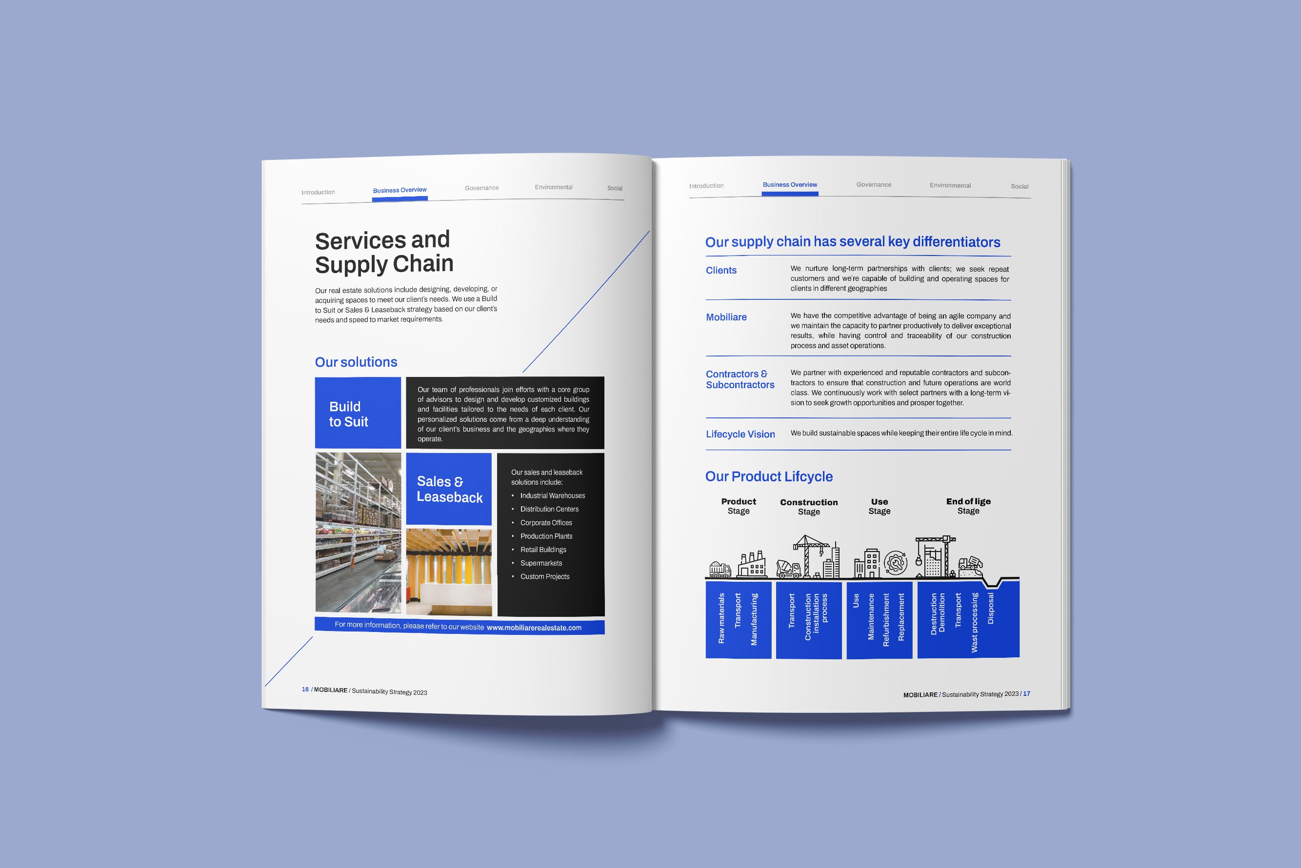 Se potenció el uso del color azul corporativo y del isotipo para darle un estilo contemporáneo al diseño. La tipografía y fotos con dimensiones grandes remarcan la solidez de la empresa.